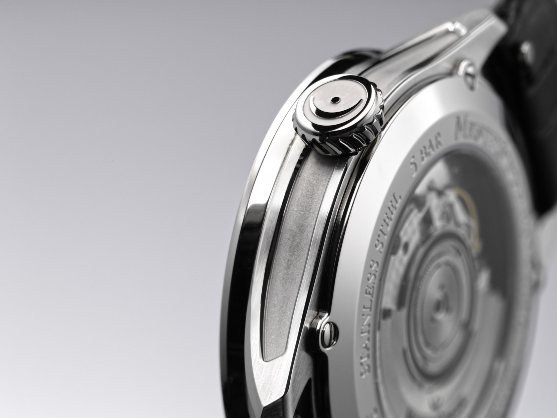 Lige over tallet 6 roterer et lille hjul én gang i sekundet, det såkaldte “sun wheel”. Det er en diskret måde at bekræfte, at uret fungerer, selvom det ikke måler sekunder på klassisk vis. Kassen har en diameter på 40,5 mm og en tykkelse på ca. 11,25-12,3 mm, vandtæthed 5 bar (50 m). Safirglas med AR-belægning foran, gennemsigtig bagkasse (man kan se det perlede modul og antracitrotoren med tre fermater). Skruekrone, blandede finish: børstet, poleret, sandblæst.